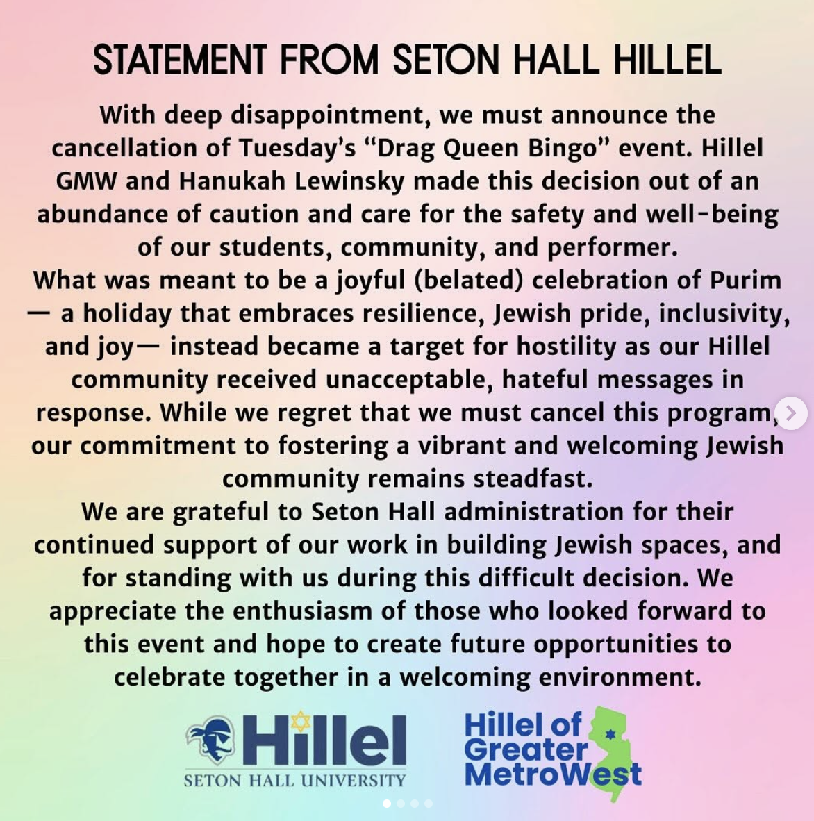 Skupina Seton Hall Hillel vydala v pondelok 7. apríla vyhlásenie, v ktorom zrušila svoje podujatie “Drag Bingo” po tom, čo sa “stalo terčom nepriateľstva, keďže naša komunita Hillel dostala neprijateľné, nenávistné správy ako odpoveď.”