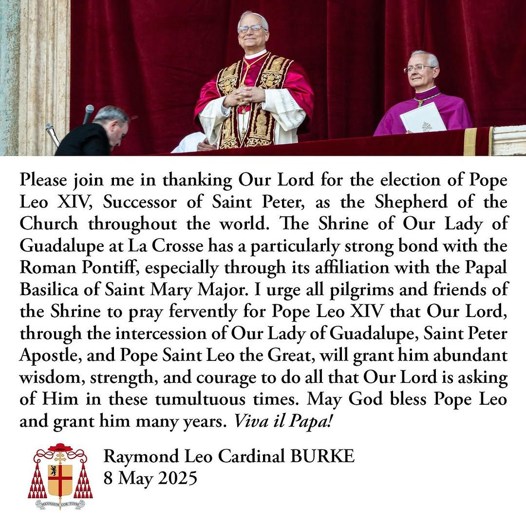 Prosím, pripojte sa ku mne a poďakujte nášmu Pánovi za zvolenie pápeža Leva XIV, nástupcu svätého Petra, za pastiera Cirkvi na celom svete. Svätyňa Panny Márie Guadalupskej v La Crosse je s rímskym pápežom obzvlášť silne spojená, najmä vďaka svojej príslušnosti k pápežskej bazilike Panny Márie Väčšej.