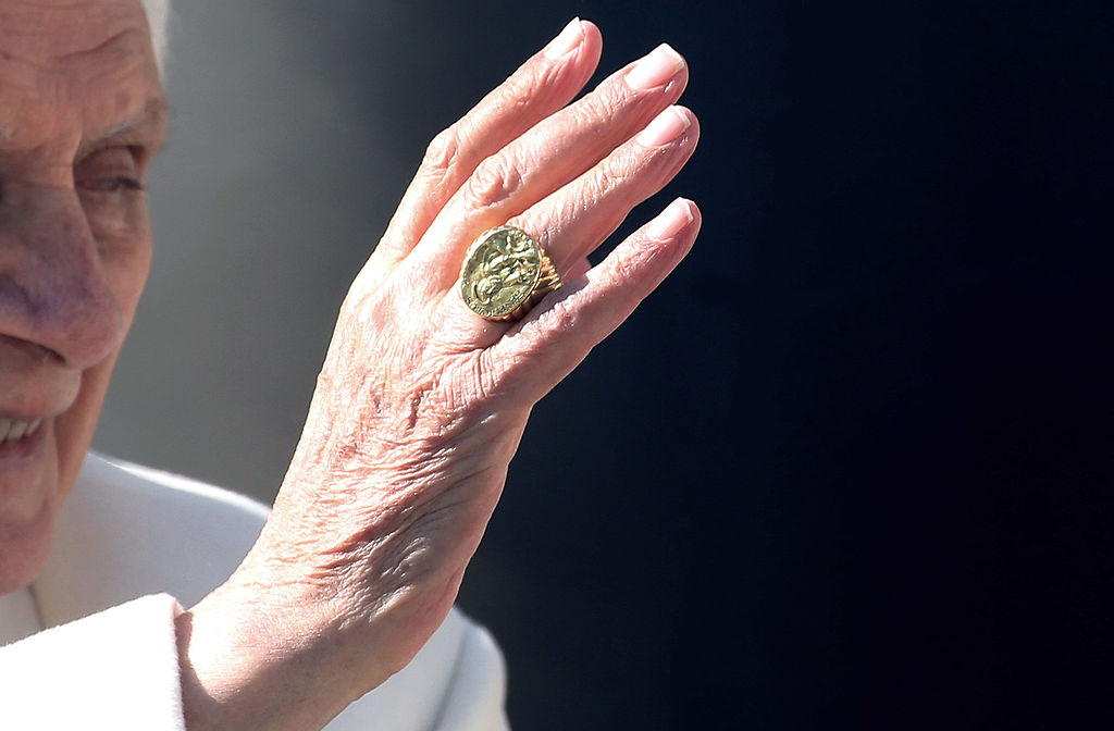 Svätý Otče, nech ti Kristus, Syn živého Boha, pastier a strážca našich duší, ktorý postavil svoju Cirkev na skale, udelí prsteň, pečať Petra Rybára, ktorý do neho vložil svoju nádej na Galilejskom mori a ktorému Pán Ježiš zveril kľúče od nebeského kráľovstva.