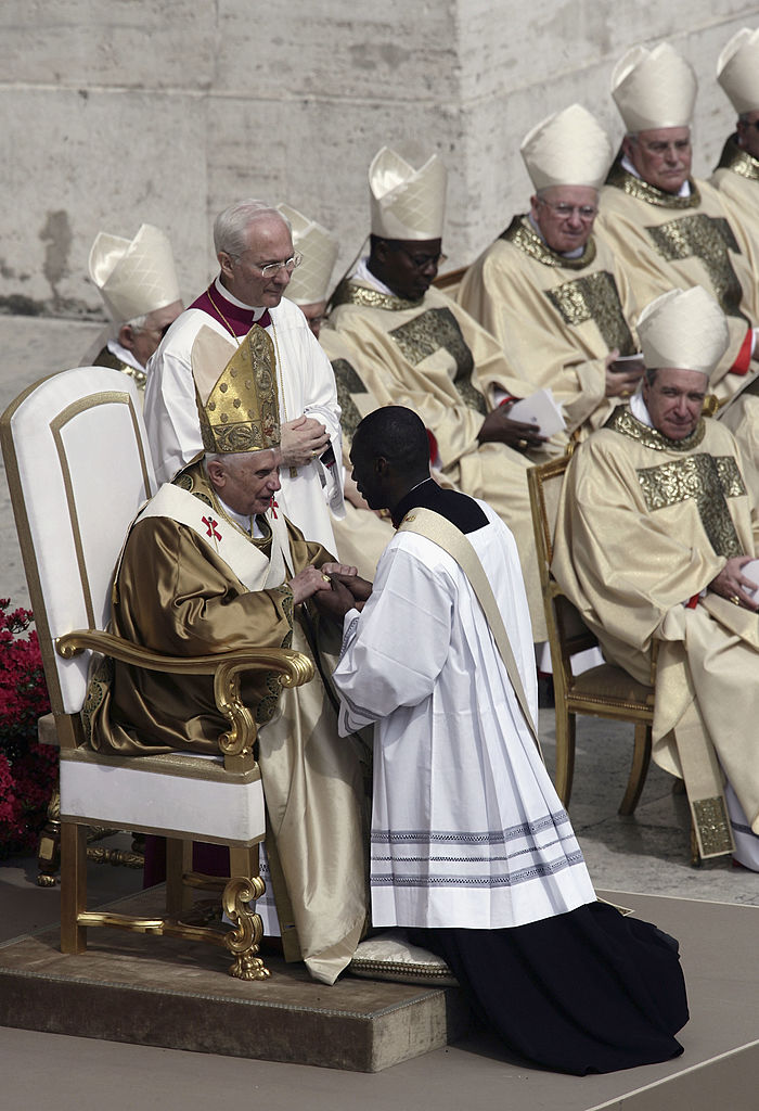 Historicky celé kolégium kardinálov prítomných na omši kľačalo pred pápežom, aby mu urobilo akt podriadenosti a pobozkalo jeho prsteň.