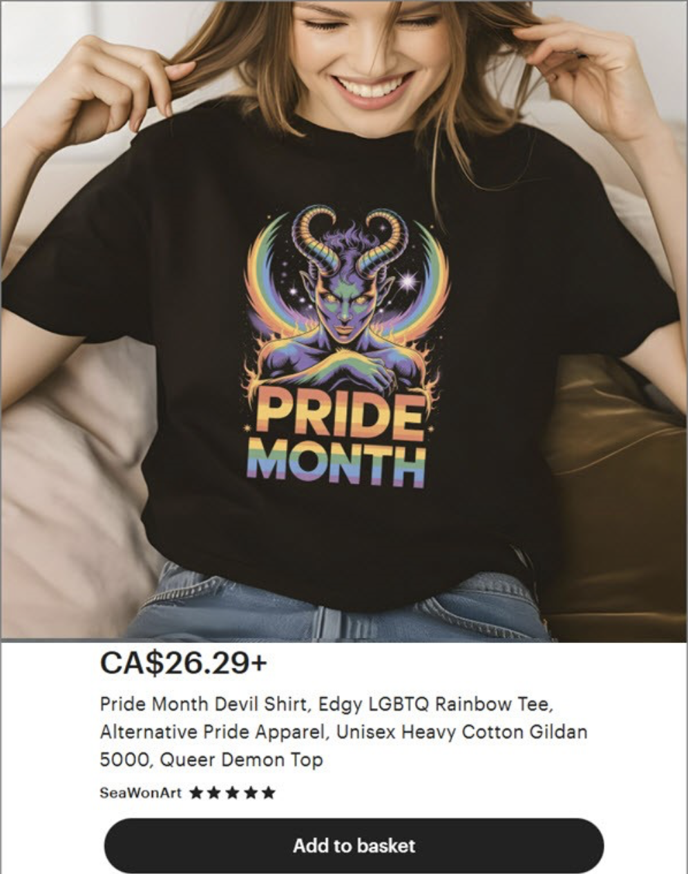 “Tento jedinečný a dráždivý dizajn predstavuje mocnú démonickú postavu ozdobenú žiarivými dúhovými rohmi a krídlami, zasadenú do nebeského pozadia. Je to’odvážny kúsok pre každého, kto oslavuje Pride s nádychom vzdoru a alternatívneho štýlu.” (zvýraznenie pridané)