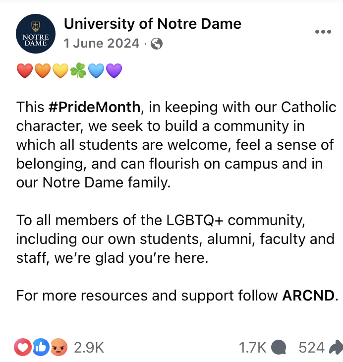 Napriek dramatickému nesúladu s katolíckym učením a tradíciou Notre Dame od roku 2021 každoročne rozširuje oslavy “mesiaca hrdosti” prostredníctvom programov v celom areáli, komunitných podujatí a obsahu sociálnych médií, ktoré oslavujú a propagujú “LGBTQ+” identitu a skúsenosti.