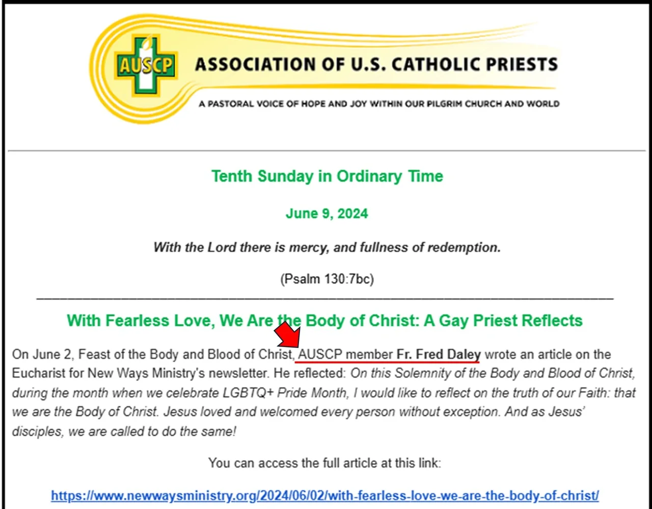 Článok New Ways Ministry, na ktorý sa AUSCP odvoláva 9. júna, napísaný o. Daleym, rúhačsky prirovnal slávnosť Kristovho tela a krvi k sodomii. Najprv sa rozplýva nad tým, že tínedžerke s transrodovou identitou (muža na ženu) v predchádzajúcej farnosti povedali, že “môže” prijať “len [sviatosť birmovania], ak bude používať svoje krstné meno a bude sa obliekať ‘primerane’ pohlaviu, ktoré jej bolo pridelené pri narodení.” Potom uviedol nasledujúce rúhačské vyhlásenie: