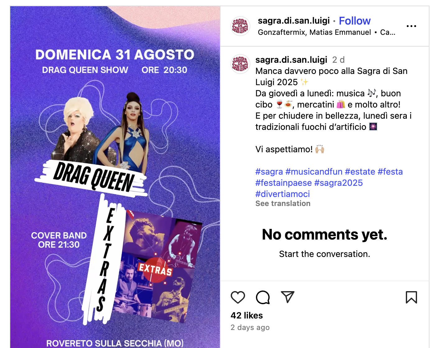 Na Instagrame post propagujúci víkendové’oslavy stále jasne uvádza drag vystúpenie ako súčasť nedeľného večerného line-upu.