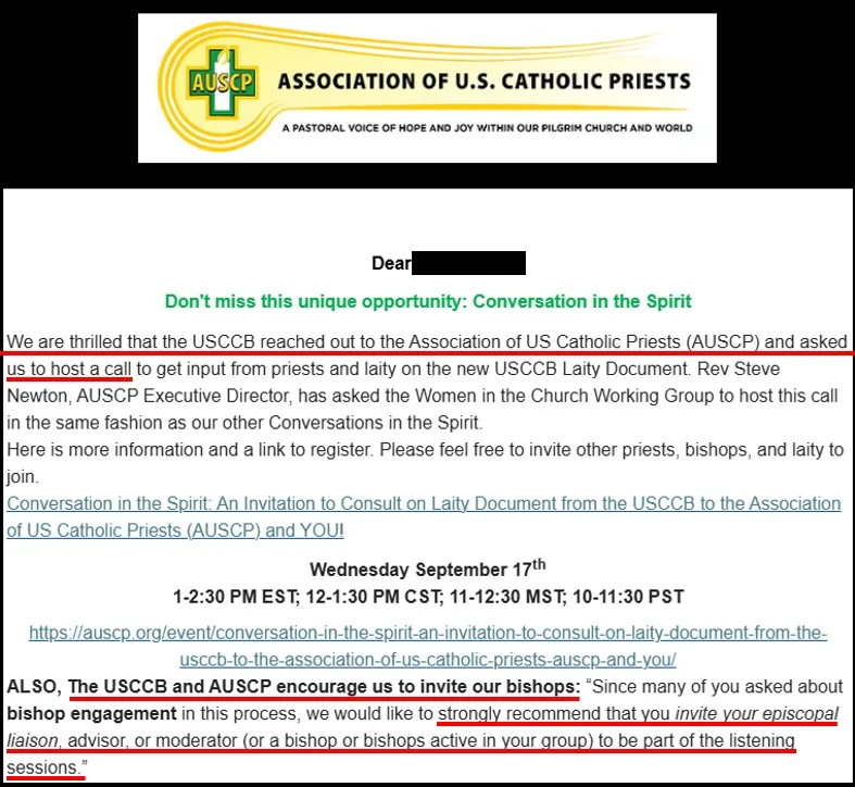 Kacírske Združenie katolíckych kňazov USA (AUSCP) začiatkom tohto roka oznámilo, že Konferencia katolíckych biskupov Spojených štátov (USCCB) sa obrátila na združenie so žiadosťou o usporiadanie virtuálnej konzultácie o dokumente USCCB’o laikoch. Vo verejných materiáloch sa toto podujatie opisuje ako spoločné úsilie AUSCP a USCCB, pričom sa prezentuje ako pokračovanie “synodálnej angažovanosti”