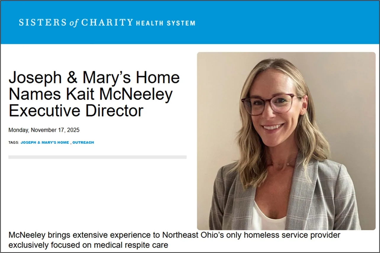 Dňa 17. novembra 2025 zdravotný systém Milosrdných sestier oznámil Kait McNeeleyovú ako novú výkonnú riaditeľku Domova Jozefa a Márie’s. Domov, ktorý v roku 2000 založili Milosrdné sestry, sa označuje za “jediného poskytovateľa služieb pre bezdomovcov v severovýchodnom Ohiu zameraného výlučne na lekársku odľahčovaciu starostlivosť.”
