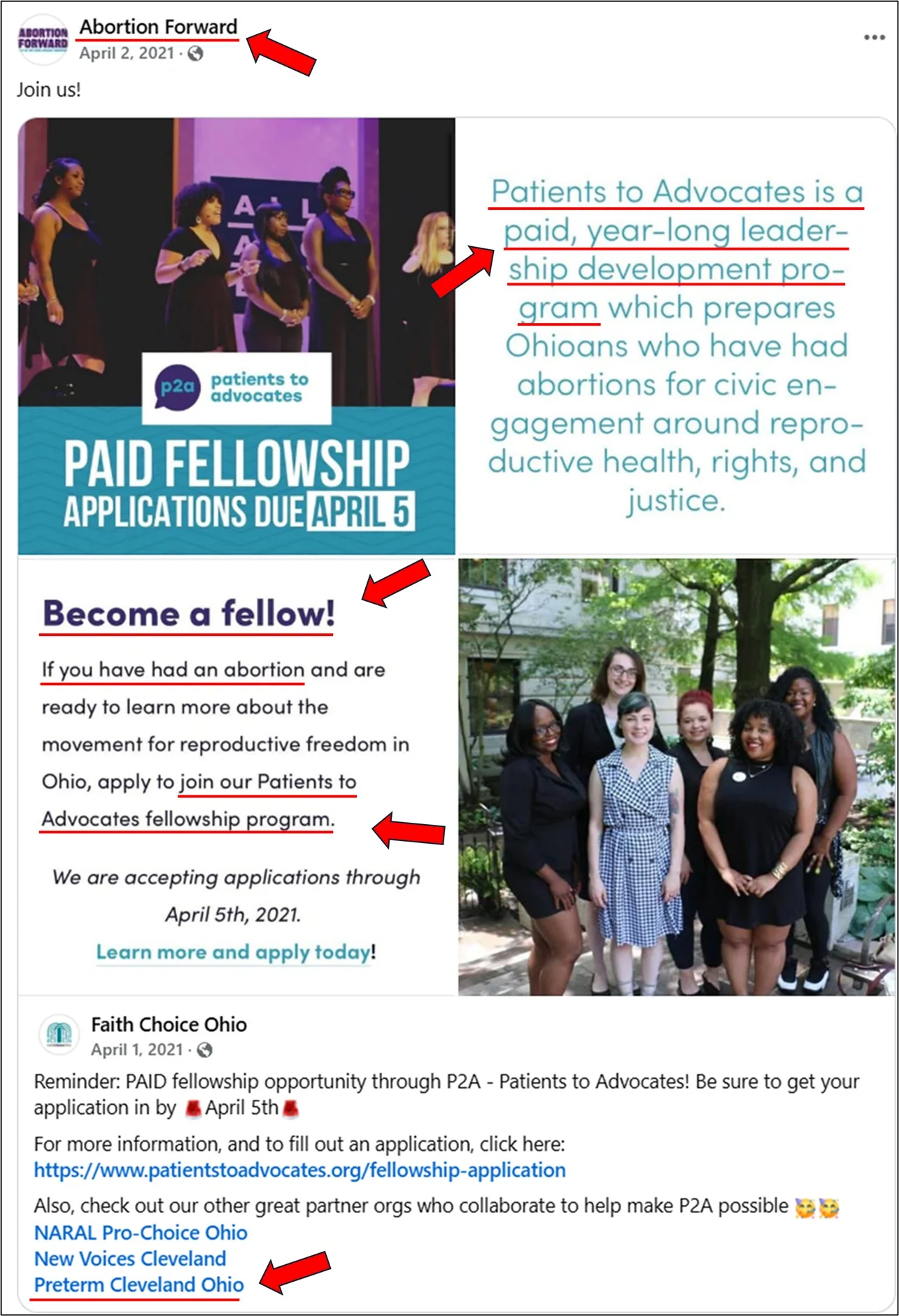 Na 2. apríla, 2021, spoločnosť Abortion Forward zverejnila reklamu na svoj program Patients to Advocates (P2A), v ktorej uviedla, že ide o “platený, ročný program rozvoja vodcovstva” pre ženy, ktoré podstúpili interrupciu a chcú sa stať obhajkyňami interrupcií. Na konci inzerátu je uvedené, že spoločnosť Preterm je účastníkom programu P2A.