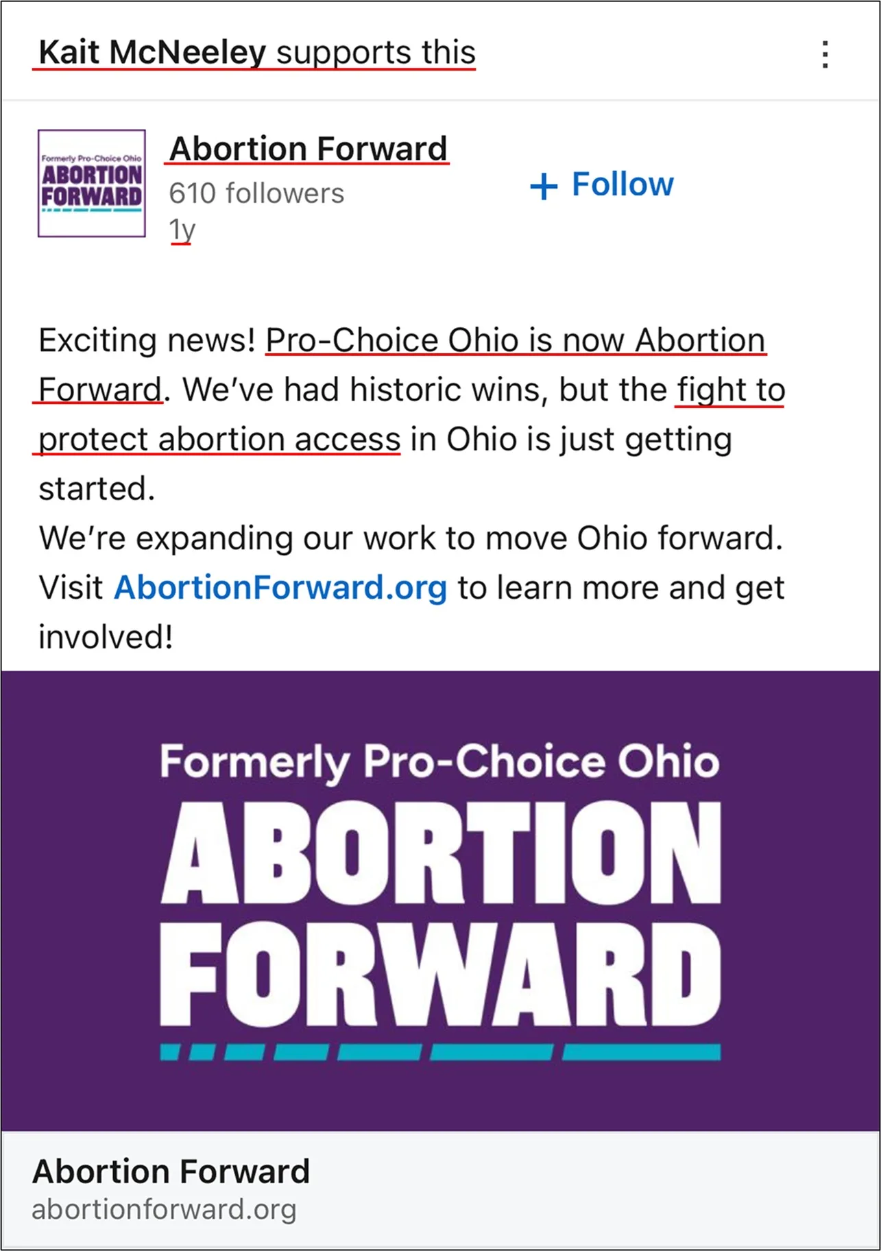 V oznámení sa spomína niekoľko aspektov McNeeleyho’profesionálnej minulosti – zástupca riaditeľa Koalície pre bezdomovcov v severovýchodnom Ohiu, výkonný riaditeľ v projekte Metanoia a správca nehnuteľností v spoločnosti EDEN, Inc. – ale pohodlne zamlčala, že od septembra 2023 až do súčasnosti bola “Patients to Advocate Fellow” pre organizáciu s názvom “Abortion Forward” alebo že od decembra 2023 až do súčasnosti pracovala ako dobrovoľníčka “clinic escort” pre Preterm, čo je zariadenie vykonávajúce interrupcie.
