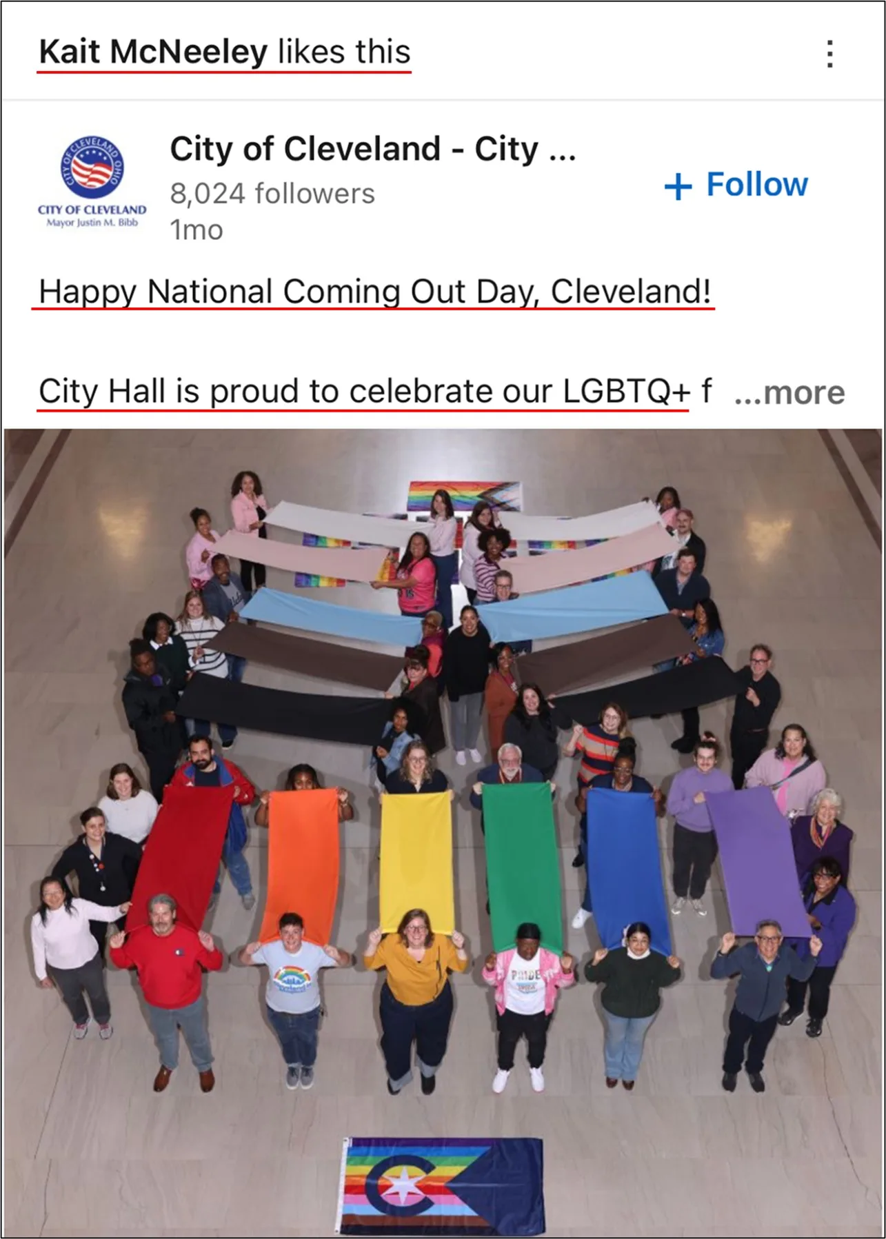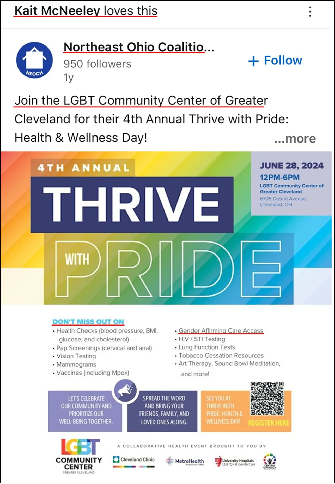 Pred rokom McNeeley “miloval” príspevok koalície, ktorý vyzýval stúpencov, aby “pripojili k LGBT centru Veľkého Clevelandu” na ich “zdravotnom” podujatí, ktoré ako jedno zo svojich ustanovení konkrétne uviedlo “prístup k rodovo pozitívnej starostlivosti”.