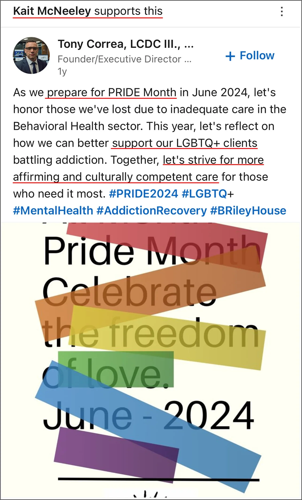 Krátko pred júnom 2024 McNeeley “podporil” vyhlásenie pri príležitosti “mesiaca hrdosti,” v ktorom vyzval na väčšiu podporu “afirming and culturally competent care.”