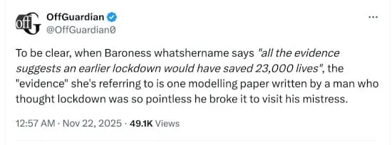 Fergusonova’prognóza toho, čo mohlo vyústi keby vláda uzavrela rýchlejšie a skôr, trpí rovnakým “odpadom dovnútra, odpadom von” bláznovstvom ako Rímsky klub’environmentálneho apokalypticizmu. Nezabúdajte, že počet ľudí, ktorých by údajne zachránilo rýchlejšie uzavretie Spojeného kráľovstva, je založený na zásadne chybnom vstupnom údaji: počte ľudí, ktorí podľa tvrdenia vlády Spojeného kráľovstva zomreli na COVID. Tí z nás, ktorí od začiatku upozorňovali na podvod už roky upozorňujú, že tieto počty úmrtí na COVID sú štatistickým šikanovaním, pretože sa opierajú o podvodné tvrdenie, že každý, kto zomrel na COVID—podľa meraní vedecky nezmyselný PCR test—v skutočnosti zomrel na COVID.