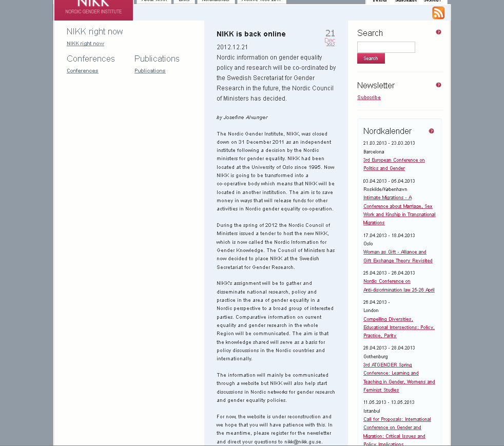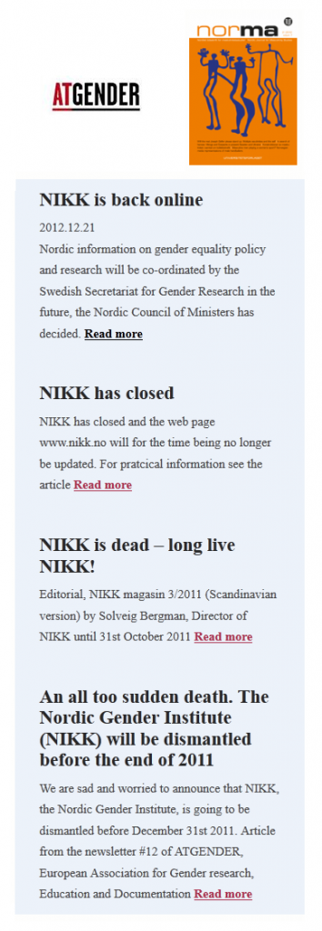 NIKK po tom čo bol rok uzavretý na rozkaz Nórskeho ministerstva pre rodovú rovnosť (31.12.2011, po tom čo bol odvysielaný dokument Haralda Eiu) oznamuje, že NIKK je opäť späť, ale v novej podobe. Bude zlúčený do iného inštitútu a presunutý z Nórska do Švédska. Ako dôvod sa uvádza šetrenie.