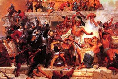 Obraz: "Útok na chrám Teocalli Cortézom a jeho vojskom" od Emanuela Leutze (všimnite si detail obrazu vľavo, pod článkom)