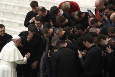 Foto: Pápež František žehná skupinu kňazov na konci svojej týždennej generálnej audiencie v sále Pavla VI. vo Vatikáne, streda 11. januára 2017. Počas neočakávanej návštevy sa pápež František…