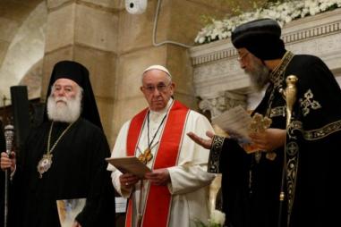Foto: pápež František a ortodoxný koptský pápež Teodor II. vpravo, zúčastňujúc sa dňa 28. apríla na ekumenickej bohoslužbe v kostole sv. Petra v Káhire.Kresťanskí predstavitelia v tejto krajine…