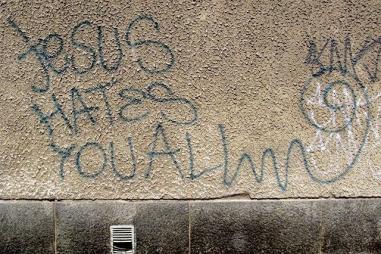 Nápis na stene: Ježiš vás všetkých nenávidí.V novej správe Observatórium neznášanlivosti a diskriminácie voči kresťanom vyjadrilo vážne "znepokojenia" týkajúce sa situácie ľudských práv v Rakúsku, a…