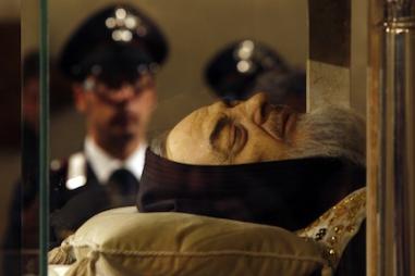 Foto: Exhumované telo sv. pátra Pia leží v sklenenej hrobke v krypte svätyni svätca v San Giovanni Rotondo, v južnom Taliansku. Páter Pio zomrel v roku 1968.Otec Wojtyla bol jedinou osobou, ktorej…