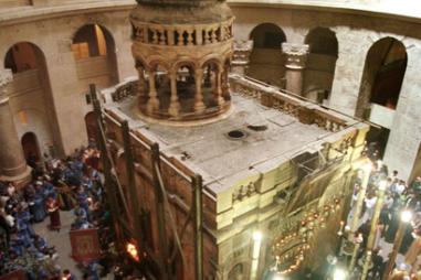 Fotka: Pohľad zhora na kresťanských pútnikov v bazilike Svätého hrobu počas ich návštevy hrobu Ježiša Krista na Veľkonočnú nedeľu 4. apríla 1999. Hrob, pod zrenovovanou rotundou, je miestom, kde bol…