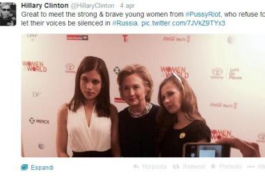 NEW YORK, USA – Bývalá ministerka zahraničných vecí USA a pravdepodobne budúca kandidátka na prezidentku USA Hillary Clintonová pózovala pred fotografmi spolu s členkami ruskej punkovej skupiny Pussy…
