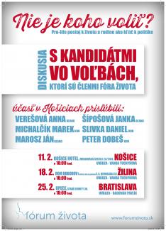 Občianske združenie Fórum života vo februári usporiada verejnú diskusiu s kandidátmi na poslancov, ktorí sú členmi združenia. Diskusie sa budú niesť predovšetkým o pro-life postoju k životu a o rodine ako kľúču k politike.