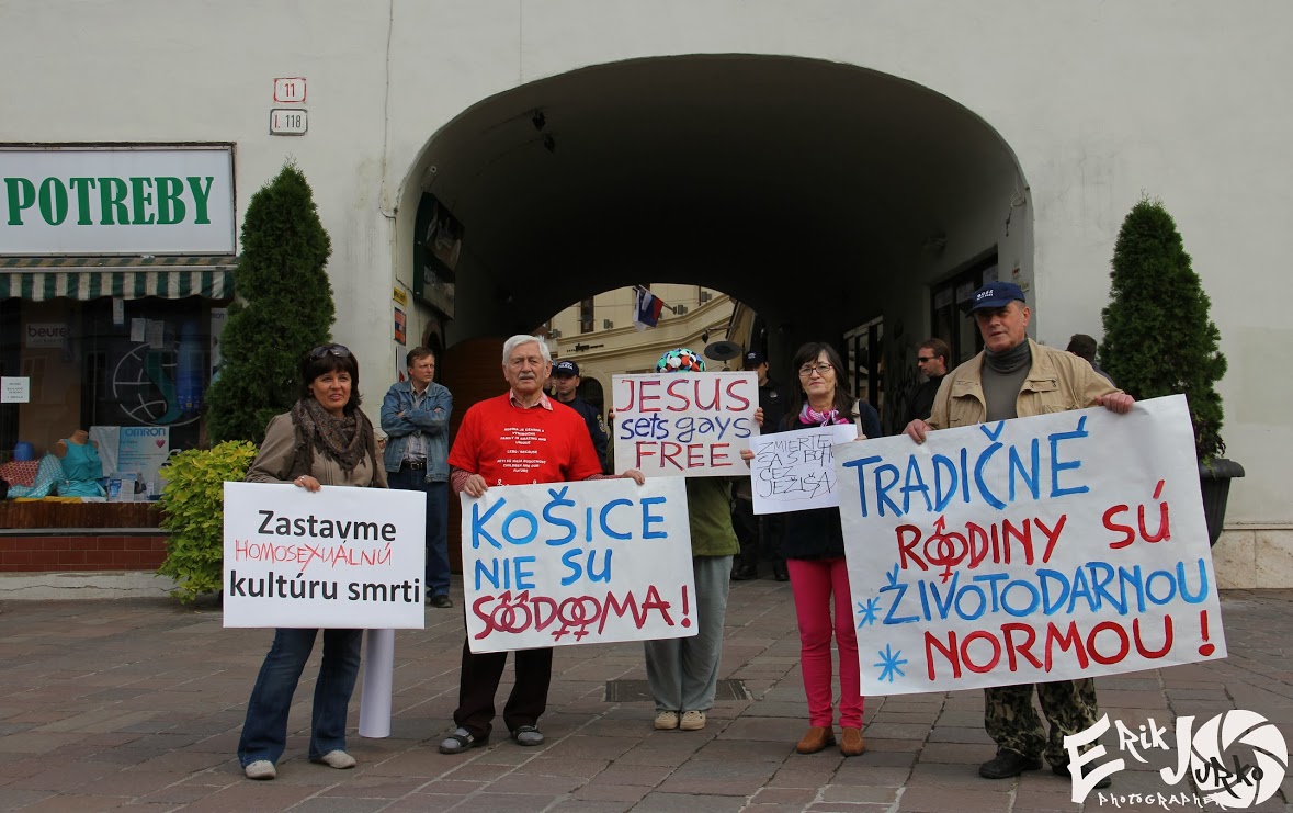 Vrátili jsme se s plakáty k teologické fakultě a volal jsem ještě jednou na rúzné evangelikální církve, ale nikdo nemél zájem. Obvolával jsem je již den před tím. Pastor jedné církve, kde chystají konferenci ohně s Kolendou mi ŕekl, že vyučuje biblickou školu... Řekl jsem mu, že by měli konferenci zahájit konfrontací jako církev ve Skutcích. Čteme-li Skutky apoštolské, tak tam byla jen jediná konference, zato tam byl nepřetržitý řetěz konfrontací. Dnes je tomu naopak. Konference ohně stíhá konferenci chvály, ale konfrontace téměř nikde. Musíme se vrátit do praxe prvních apoštolů. K nám s mojí ženou se přiidaly dvě místní sestry, z nichž jedna byla od babtistů a jeden starší aktivista FAK ( Forum angažovaných křesťanů ) z Trnavy, br. Mojmír Kovář. Bylo nás pět jako v Poláčkovi, ale měli jsme osm plakátů. Karel Poláček byl židovský spisovatel, který také skončil v holokaustu. Tři lidi nám chyběli. Půl hodiny před zahájením duhového pochodu jsem šli na to místo střetnutí u jižní brány, kde se již rojila skupina mladíků. Byli, to členové, příznivci a aktivisté ,,Lidové strany naše Slovensko,, ( dále: LSNS) a sjíždělo se dost policistů. Bylo nás pět a nesli jsme mimo jiné dvě nepřehlédnutelná hesla, že Ježíš osvobozuje, uzdravuje a dává nový život. Druhé velké heslo s nápisem: Tradičné rodiny sú životodárnou normou. Moje žena nesla anglický nápis, že Ježíš osvobozuje gaye, Mojmír nesl nápis ,, Košice nejsou Sodoma a sestry si nechaly napsat nápis: Zmierta se s Bohom skrze Ježiša. ( Viz fotky v příloze ) .Aktivistů duhového pochodu bylo zatím málo. Zpočátku asi patnáct, ale byli to spíš studenti středních a vysokých škol, neformovali se do dvojic jako v Praze. Jedna dívka měla nápis: ,,Som homosexi, nie hejterosexi.
