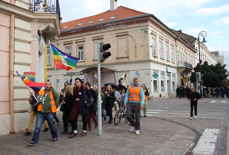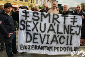 Shromáždění aktivistů LSNS zcela jistě inspirováno naším heslem a rozhovory, začalo skandovat místo volání o smrti naše heslo: ,,Chceme tradiční rodiny". Dle jedné reportáže z novin bylo vidět jednoho aktivistu národnostní strany, jak drží v náručí romské dítě a volali:,,Rodina je otec, matka a děti.,, I policajti byli tím překvapeni spolu s lidmi z masmedií. Ježíš řekl, že budou volat i kameny, když my budeme mlčet. Zde byla místo kamenú skupina si 70 aktivistů legální strany, jejíž název je: ,,Lidová strana naše Slovensko". V té chvíli nás oslovila jedna katolička, proč podporujeme ,,tyto extrémisty". Řekl jsem ji, že zde stojíme proti demonstraci zvrácení základních životních a etických hodnot, a že oni i my jsme občané, kteří za každou svou stranu sem pŕišli svobodně vyjádřit svůj názor. Tato strana je povolena vládou SR a její aktivisté mají tedy právo se veřejně vyjadřovat v rámci zákona. Ptal jsem se jí: Proč tu není víc katolíkú? Vždyť pŕed týdnem zde bylo přes sto tisíc hájit život? V té chvíli drželi policisté mladíky s praporem strany LSNS dost tvrdě opodál, aby mohla na podiu začít promluva Homoaktivistú. Z několika pŕipravených ŕečníkú za homosexuály, kteří ze strachu před odporem odmítli promluvit, vystoupila jen jedna statečná dívka a za pískotu a křiku mluvila fráze o lidských právech. Po ní promluvil hlavní organizátor a řekl že homosexuálové mají právo vychovávat děti rozvedených rodičú a že jim poskytnou lepší výchovu. Všiml jsem si, že spolu s námi pískali i lidé stojící hodně opodál. Ve chvíli, kdy mluvil své fráze o právech organizátor akce, se pokusil Mojmír s ním zahájit občanský dialog. Ten homo-aktivista ho téměř zhodil z podia. Vystoupil jsem na podium a ptal jsem se jich. odkud chtějí brát děti ? Jistě je budete chtít získávat skrze juvenilní soudy i na Slovensku, kde se tento zločinecký zákon má prosadit v parlamentu. Byl jsem hrubě vykázán. Aktivisté LSNS volali: Chceme tradiční rodiny. Ve chvíli, kdy se na ně zaměřily kamery televizních štábů, rozvinuli svoji zástavu: ,, smrt deviantům...