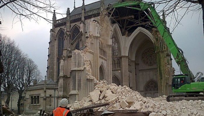 Poznámka šéfredaktora: argument o tom, že niektoré kostoly je lacnejšie zbúrať ako renovovať, neobstojí. Demolácia neogotického skvostu v Abbeville z 1868, stála 350 000 euro. Krátke video: