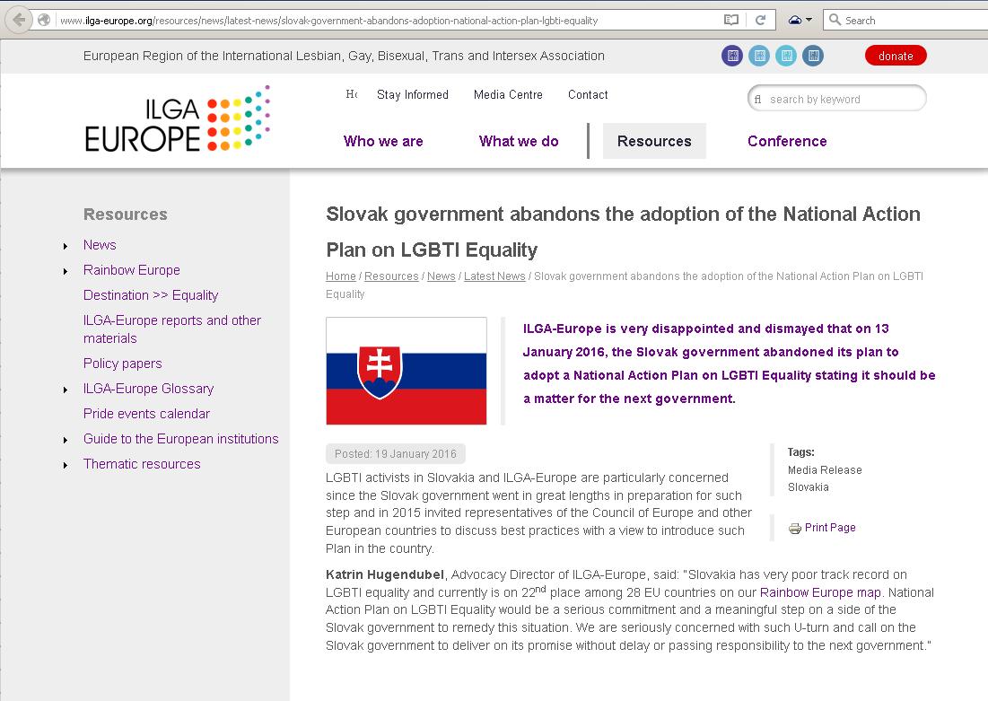 Foto webu európskej homolobistickej skupiny ILGA. Homolobisti maju informácie, ktoré niesu ani na webe úradu vlády. Zo smútkom oznamujú, že Slovenská vláda na rokovaní 13. januára odsunula schvalovanie Narodného akčnom plánu pre LGBTI na novú vladu po volbách. Túto informáciu na oficialnych stránkach vlády nenájdete. Ako je to možne, že homo-lobisti z Bruselu sú lepšie informovaný ako slovenské štátne inštitúcie? Kto vo Vláde vynáša informácie?