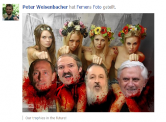 Peter Weisenbacher zdieľa a hlási sa k fotomontáži radikálnej feministickej skupiny FEMEN, na ktorej sú zobrazené odrezané hlavy ruského prezidenta Putina, bieloruského prezidenta Lukašenka, moskovského patriarchu Kirila I. a pápeža Benedikta XVI.