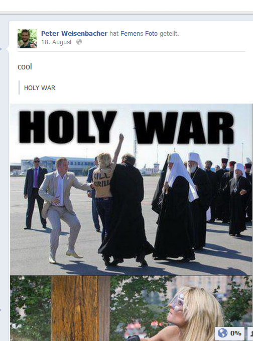 Peter Weisenbacher zdieľa a hlási sa (s komentárom „cool“) k výzvam skupiny FEMEN na zavraždenie moskovského patriarchu Kirila I. (nápis na nahom tele dievčiny znie „Kill Kiril“ – zabite Kirila) a k spíleniu gréckokatolíckeho kríža aktivistkou FEMEN, ktorý bol vztýčený na pamiatku obetí stalinského teroru a holodomoru na Ukrajine.