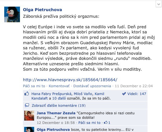 V súvislosti so zamietnutím Estrely pani Záborská píše "Verím v silu modlitby" čo Pietruchová skomentovala slovami "Záborská zažíva politický orgazmus". Na snímke zaslanej do redakcie vidieť, že Pietruchová ešte dodala "bože to sú patetické kraviny..."