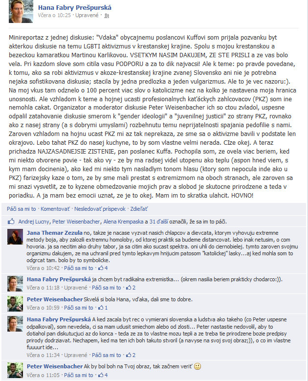 Hana Fabry Prešpurská A mne, kedze som nechcela, aby sa rozputavali vasne, sa chcelo este aj zvracat samej zo seba, kedze som niekolko raz sama zdoraznila, aby sme nevytahovali jednotlive "extremne" priklady, lebo, citujem sa, "je ich dost na jednej aj druhej strane a sedeli by sme tu do zajtra". Toto bolo z mojej strany velmi neuprimne... ja totiz o extremizme z NASEJ AKTIVISTICKEJ strany neviem nic! A neverim, ze tu je! A ako sa nasi ludia vyjadruju vo virtulanom priestore, to neviem, lebo necitam diskusie ani nic... Kazdopadne aktivisticke mimovladky ziaden extremizmus nepestuju. Aj ked pre PKZ je extremizmom uz spajanie LGBTI ludi s ludskymi pravami.