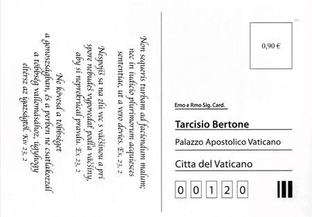 Pohľadnicu dali v náklade 20-tisíc kusov vytlačiť priaznivci Róberta Bezáka. Adresovaná je vatikánskemu štátnemu sekretárovi Tarcisiovi Bertonemu, ktorý je pravou rukou pápeža Benedikta XVI.