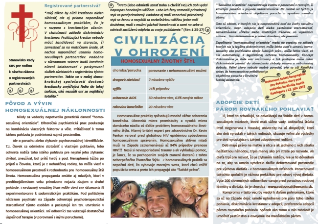 Leták varuje pred tým, že schvaľovanie homopraktík má byť nanútené všetkým, ako to vidíme už na Západe. Otvára oči – áno aj o tom, čo je ohrozenie civilizácie. To si však treba prečítať pod štatistikami, ktoré sú len úvodom. Vo vytlačenom letáku sú štatistické údaje o fyziologických ochoreniach, ktoré sú podstatne častejšie u tých, ktorí vedú homosexuálny život (to nie sú všetci homosexuálne cítiaci): rakovina konečníka, HIV/AIDS, syfilis, závislosť na drogách. Čoskoro dáme všetky odkazy na štúdie na www.nehomopartnerstvam.sk pre tých, čo leták spochybňujú.