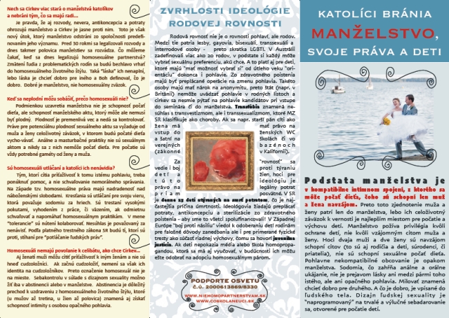 Toto, čo referendu predchádza, by malo byť pre všetkých slobodne zmýšľajúcich ľudí budíčkom, že niečo nie je v poriadku s našou „demokraciou“. Média, ktoré licencuje štát, nechcú dať priestor pre informovanie o tomto nástroji priamej demokracie. Nechcú, aby ľudia čo i len tušili o referende. Niekto ešte pochybuje o tom, že sloboda, rodina a deti sú ohrozené? O tom, prečo máme ísť v referende brániť manželstvo, naše práva a deti informuje náš leták. Dali sme vytlačiť verziu pre katolíkov a pre kresťanov v slovenskom i maďarskom jazyku, pripravujeme verziu pre nekresťanov. Ponúka argumenty na časté otázky týkajúce sa manželstva, homosexuality i rodovej ideológie, ktoré nedostávajú priestor v médiách.