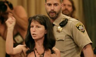 Demonštrantka Gypsy Taubová protestuje proti zákazu nahoty na verejnosti.