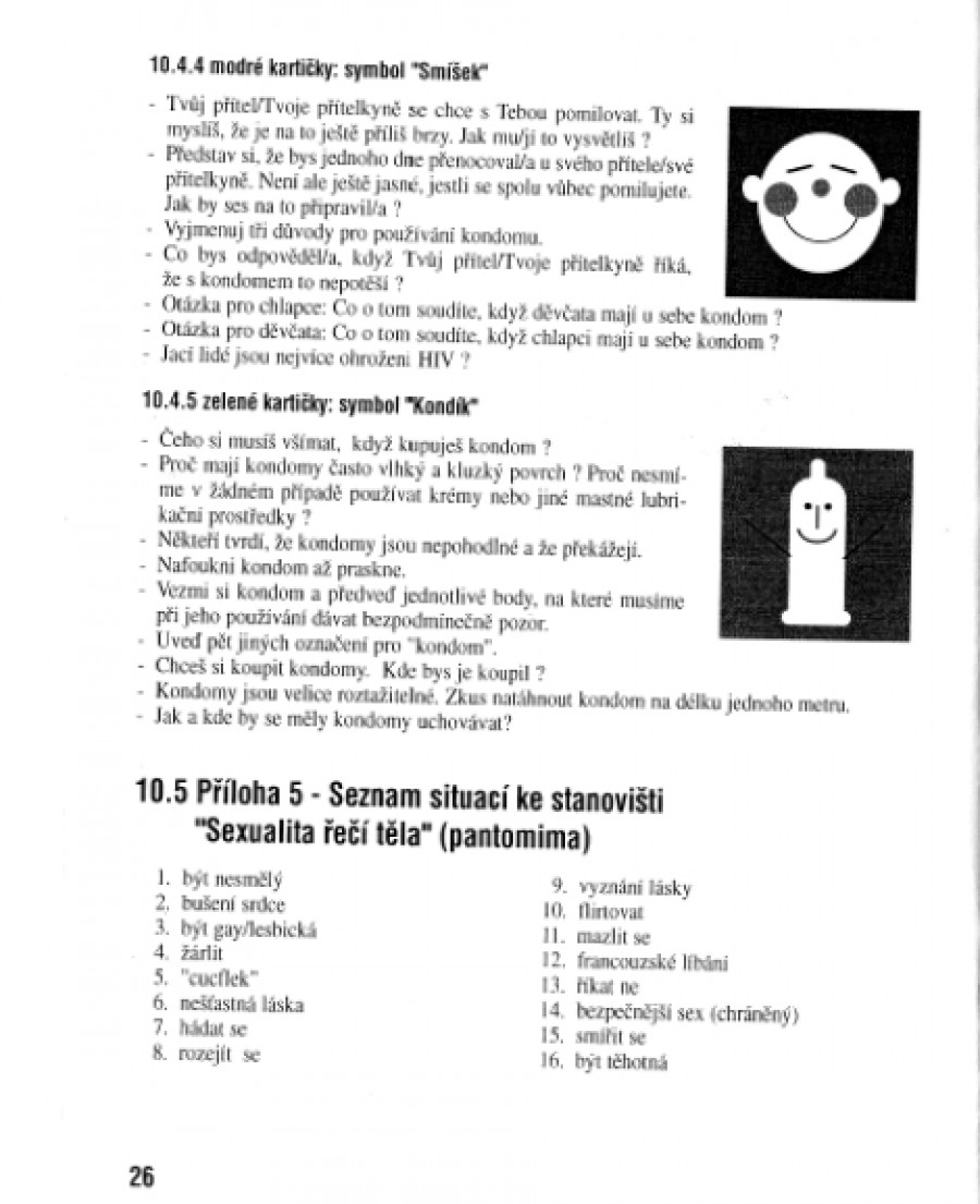 Skoro nedostupný manuál projektu Hrou proti AIDS z Českej republiky je silnou bombou. Áno, v Českej republike majú deti v dvojiciach pantomímou predviesť tieto situácie byť lesbický, byť gay, francúzsky bozk, bezpečnejší /chránený/ sex, flirtovať, maznať sa, cucflek. Podľa istých výskumov 87 % pätnásťročných detí v čase realizácie projektu Hrou proti AIDS, nezačalo sexuálne žiť. Ako Vám znie pre túto skupinu teenagerov takáto otázka z manuálu: „Predstav si, že by si jedného dňa prenocoval/a u svojho priateľa/priateľky. Nie je ale jasné, či sa spolu vôbec pomilujete, alebo nie. Ako by si sa na to pripravil/a?“ Hodnotenie, či je to vhodné, ponechávam na čitateľa, lebo o tom nie je reč, píše na svojom blogu Anton Chromík hovorca Aliancie za rodinu.