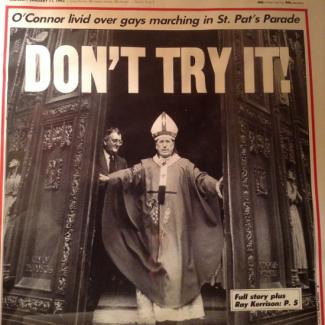 Foto: obálka (neznámeho) časopisu z 1993. Írsky kardinál O' Connor sa rozhodne vyjadril k účasti LGBT na tradičnom katolíckom pochode sv. Patrika: ANI TO NESKÚŠAJTE!