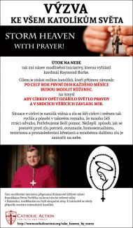 Kardinál Raymond Burke vyzýva všetkých katolíkov sveta, aby zaútočili modlitbou ruženca na nebo. Takto chce kardinál získať aspoň milión katolíkov, ktorí prijmú záväzok – Po celý rok v prvý deň v mesiaci každý mesiac, sa modliť ruženec – NA ÚMYSEL – Aby Cirkev opäť ožiarilo svetlo pravdy a v srdciach veriacich závladol pokoj.