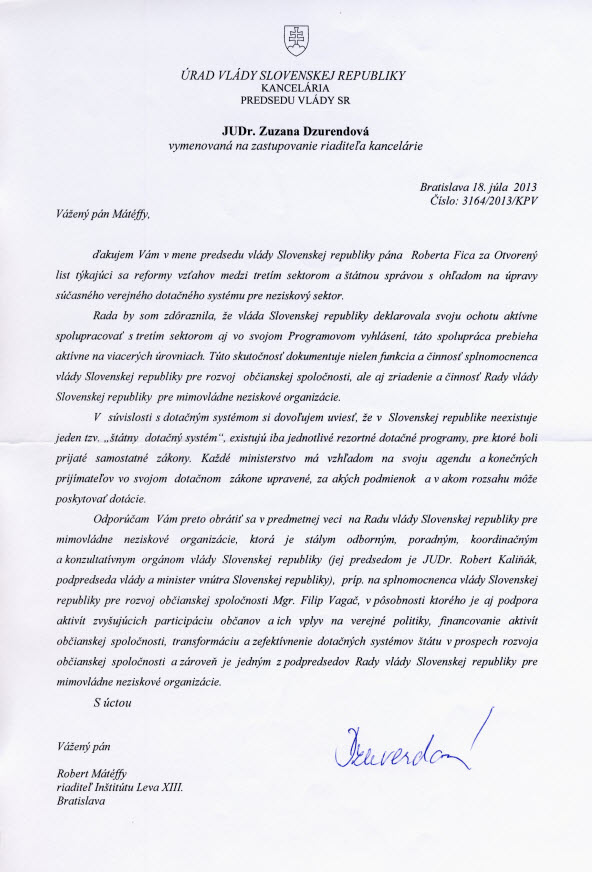 Konečne, po 3 mesiacoch čakania, sme obdržali oficiálny list z kancelárie Premiéra Slovenskej Republiky na výzvu Mimovládnych organizácii (MVO) zo dňa 10.4.2013.