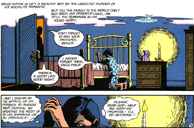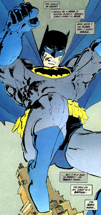 V diele z roku 1986 s názvom Batman: Návrat temného rytiera (nepatrí medzi hlavné diela o Batmanovi), sa Batman po 10 ročnej prestávke vracia do boja proti zločinu. Na opísanie svojich pocitov tu používa sviatostnú symboliku: "Mali by to byť muky. Mal by som byť len hŕbou boľavých svalov - zlomený, opotrebovaný, neschopný sa ani len pohnúť. A keby som bol starší, určite by to tak bolo... Ale ja mám znova asi tridsať, nie dvadsať rokov. Dážď na mojej hrudi je ako krst. Znova som sa narodil..."