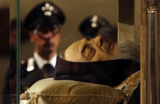 Foto: Exhumované telo sv. pátra Pia leží v sklenenej hrobke v krypte svätyni svätca v San Giovanni Rotondo, v južnom Taliansku. Páter Pio zomrel v roku 1968.