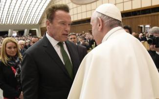 Herec, bývalý guvernér Kalifornie a hollywoodska hviezda Arnold Schwarzenegger sa stretol s pápežom Františkom na konci audiencie.