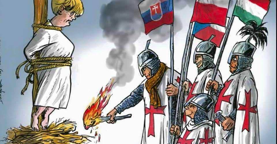 Pozn. šéfredaktora: kým Nemecko smeruje k civilným nepokojom, zatiaľ vidí krajiny nášho regiónu ako bezdôvodných antimoslimských fanatikov. Tu je vtipná reakcia západnej tlače na to, že stredná Európa sa bráni prerozdeľovaniu mladých mužov, ktorí mali tisíce eur na príchod do Nemecka. V slniečkárskom preklade - utečencov-migrantov. My (a zjavne aj všetky vlády na obrázku) to voláme predvídavosť k problémom, ktoré sú nevyhnutné.