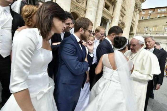 Pápež František sa s novomanželmi stretol 9. septembra 2015 na Námestí svätého Petra počas generálnej audiencie (L’Osservatore Romano).