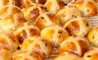 Tradičné kysnuté veľkonočné buchty s ríbezľami alebo hrozienkami ozdobené „krížom“ z citrónovej polevy sú súčasťou anglickej kultúry už od stredoveku.