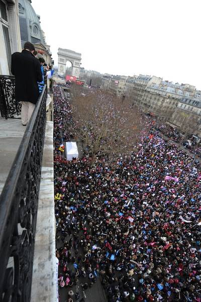 Tentokrát to však muselo byť menej. Oficiálne zdroje zastavili počítanie pri čísle 300 000, a to aj napriek vopred oznámenému plánu, že ak sa ulica za Víťazným oblúkom, kde sa demonštrácia konala, zaplní (čo znamená, že tam bude asi 1,2 miliónov ľudí), otvoria ďalšiu ulicu, kde sa budú môcť demonštranti posunúť. Toto sa udialo o 15:00. Následne sprístupnili ďalšiu ulicu, ale napriek tomu boli davy tak natlačené, že mnoho ľudí sa doslova vylialo na námestie l’Etoile, ktoré rozdeľuje Champs od ulice Grande-Armée s obrovským pódiom. Autorka tohto článku pozorovala časť demonštrácie z balkóna na 6. poschodí a môže dosvedčiť, že úzko poprepájaný nehybný dav zaplnil ulice medzi Víťazným oblúkom a riekou Seinou, čo je približne šesť kilometrov.
