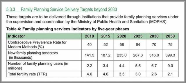 - „Podporné programy, ktoré zintenzívnia celonárodné kampane na podporu a zvýšenie verejného povedomia o dôsledkoch rýchleho rastu populácie na blahobyt jednotlivých rodín a národný socio-ekonomický rozvoj. Tak by sa vytvorila želaná norma malých rodín; túžba po kvalitnom živote je protikladom vysokých počtov členov rodín.” (Rokovacie podklady o Populačnej politike pre národný rozvoj)