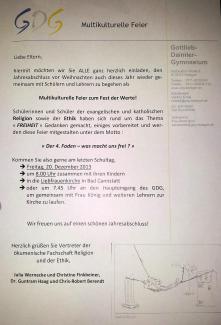 Potláčanie najlepších a najkrajších tradícií v Nemecku niekedy prináša podivuhodné ovocie. Gymnázium v štutgartskej časti Bad Cannstatt oslavuje 20. decembra koniec roka „Multikultúrnou oslavou Sviatku hodnôt“ namiesto konvenčnej adventnej omše. Ironicky, Katolícky kostol Našej Panej sprístupnil chrám pre tento etický nezmysel. Namiesto omše vo 4. adventnom týždni sa odohrala oslava pod mottom: „4. niť - čo nás robí slobdnými?“ Organizátorom je Ekumenická študentská rada náboženstva a etiky.