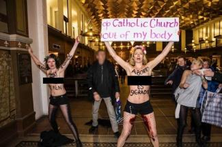 ŠTOKHOLM – Trojica do pása nahých protestujúcich demonštrantiek z organizácie Femen vtrhla pri večernej svätej omši 30. januára do katolíckej katedrály v Štokholme. Ženy držali v rukách anglické nápisy „Katolícka cirkev, preč z môjho tela“ a skandovali „moje telo, moje pravidlá.“